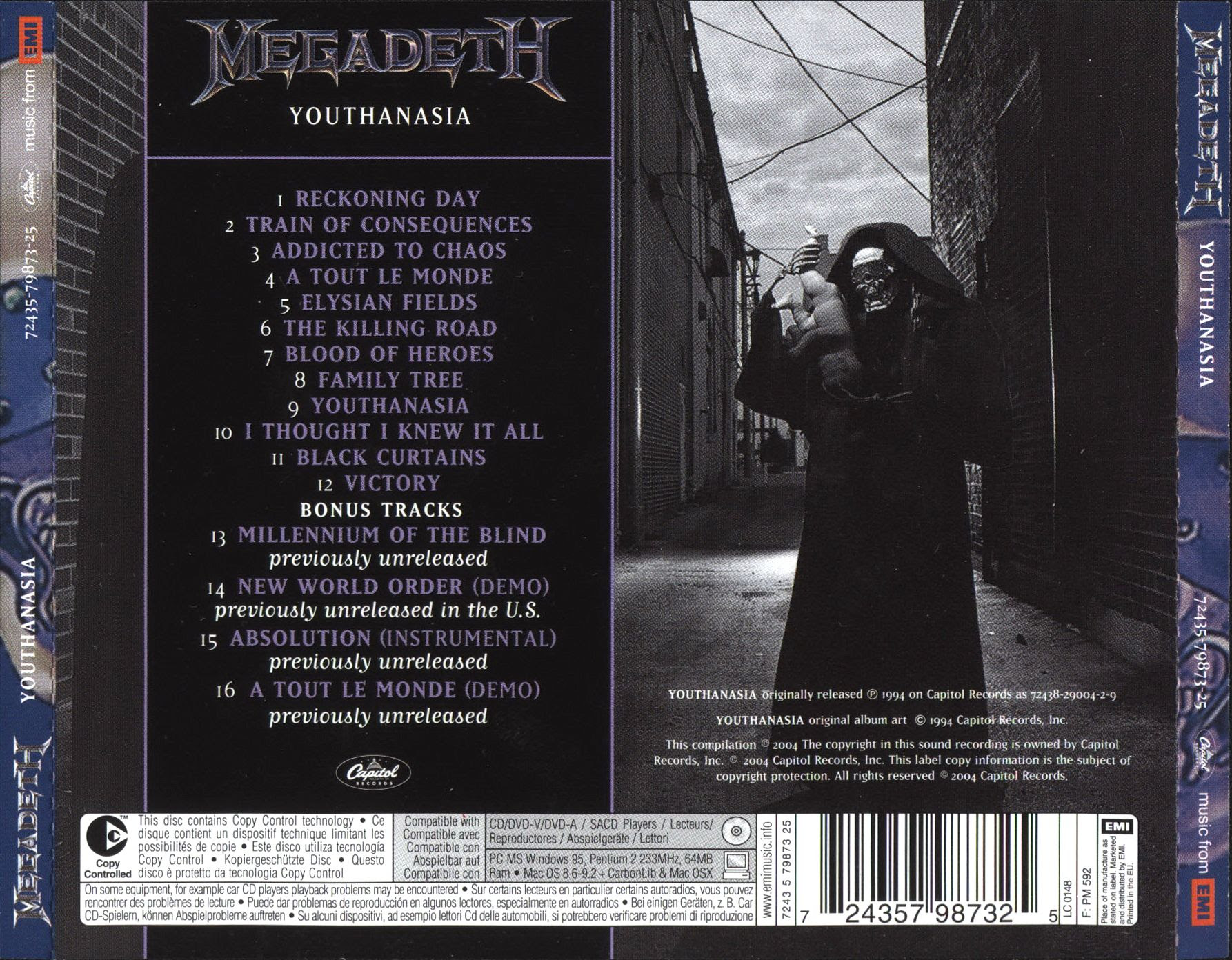Youthanasia is the sixth studio album by American thrash metal band Megadeth, released on November 1, 1994 through Capitol Records. The album is not a large stylistic departure from the band's earlier recordings; however it marked the continuing evolution of Megadeth, following the footsteps of their previous album Countdown to Extinction (1992). This album made huge commercial success so it was released in Japan and also later was remastered. In this archive I have included the Japn edition along with the bonus tracks from the remastered edition. Architecture Of Aggression (Demo) (Previously Unreleased) & Symphony Of Destruction (Demo) are also included as a bonus track. Blow your speakers...